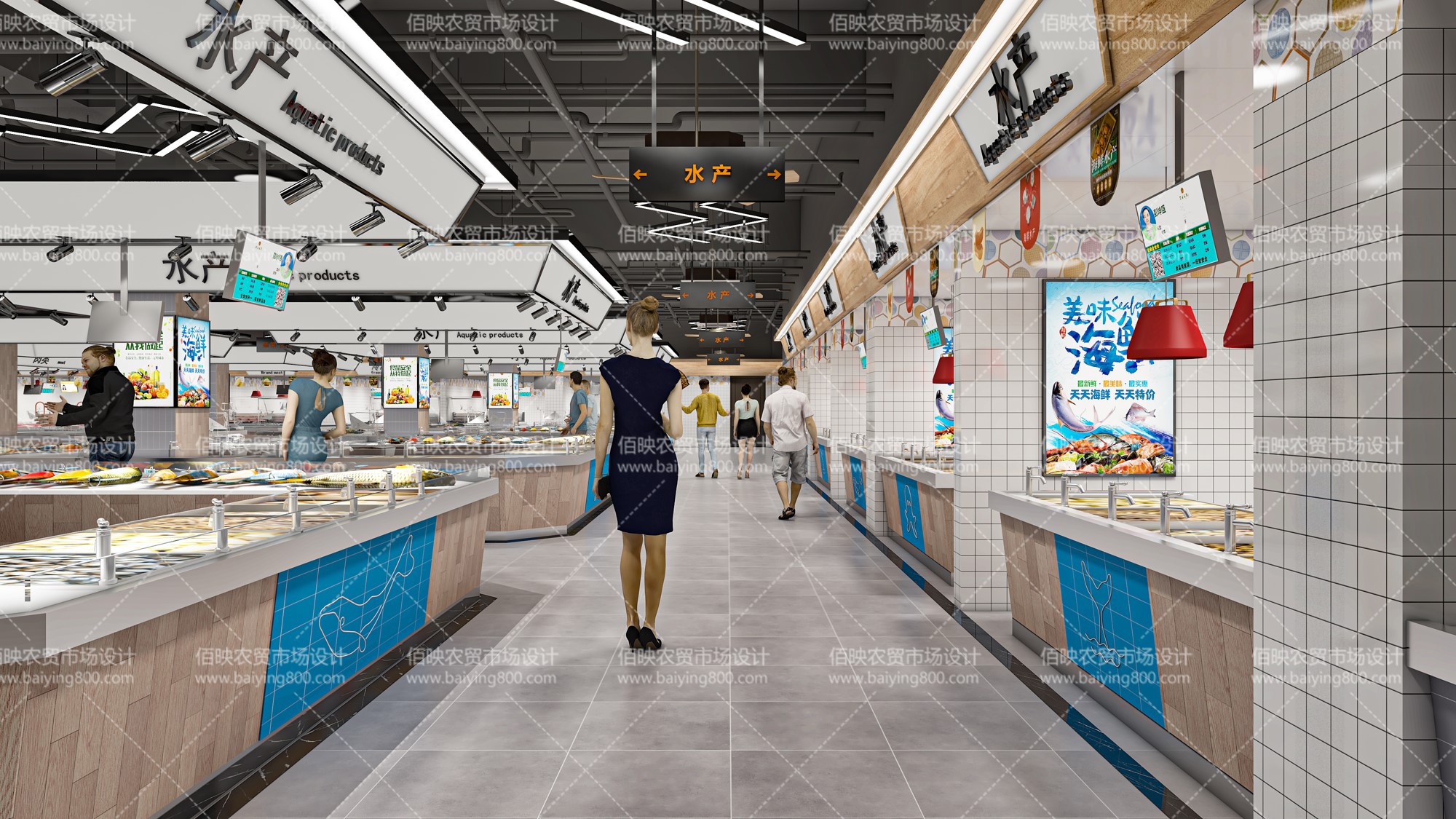 要符合市場特點并與市場環境相互協調,設計的高度需要符合經營者及消費者的習慣,柜臺后方同樣需要合理設置儲藏空間,邊緣可采用不銹鋼進行設計。活魚攤點應在魚池和魚盆上設置隔水護欄并向攤內傾斜,以防止養魚水外濺造成通道地面濕滑,并且攤位需配備剖魚臺。
