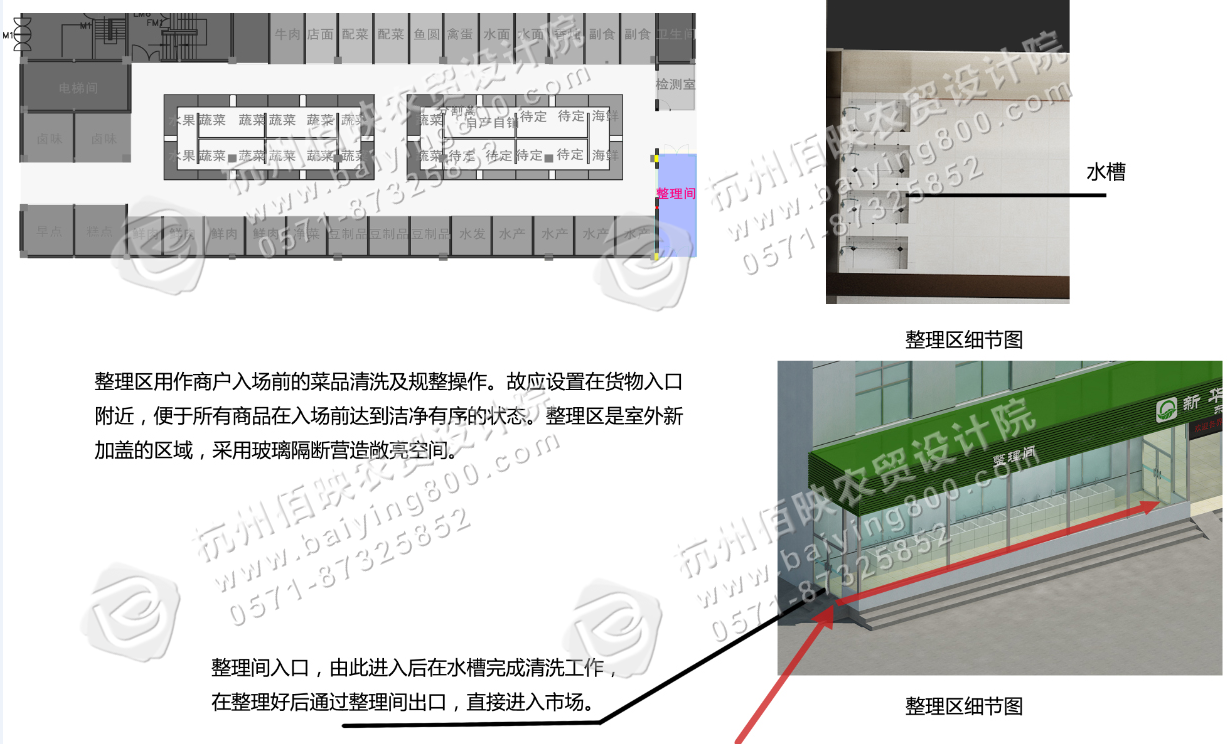 1、蔬菜整理間;也可稱整理區(qū),是蔬菜等攤位需要用到的服務(wù)設(shè)施之一。蔬菜等菜品每天需要經(jīng)過精心的清洗、整理、除雜后,方可上市,設(shè)置公用的蔬菜整理間可以有效防止污水、雜物出現(xiàn)在市場(chǎng)的各個(gè)角落,在蔬菜整理間內(nèi)統(tǒng)一使用、統(tǒng)一清潔,十分方便。