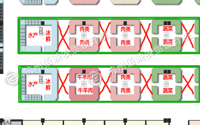 以共享思維模式來解決配套功能,例如蔬菜整理間、熟食預進間等,這些功能都是規范要求必須配備的,但我們可以在一定程度上以“借用”的思維來處理,多個蔬菜攤位共用一個整理間,兩個熟食營業房共用一個預進間,既滿足了規范要求,又能節約空間,何樂而不為呢?