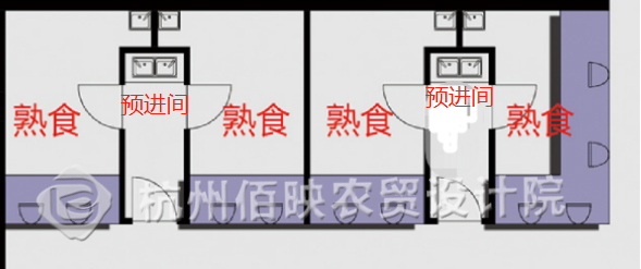 (如圖所示,為4個熟食營業房,共用2個預進間的巧妙規劃。相對于每個熟食營業房分別設置預進間的標準化做法,節約了2個預進間的公攤面積)