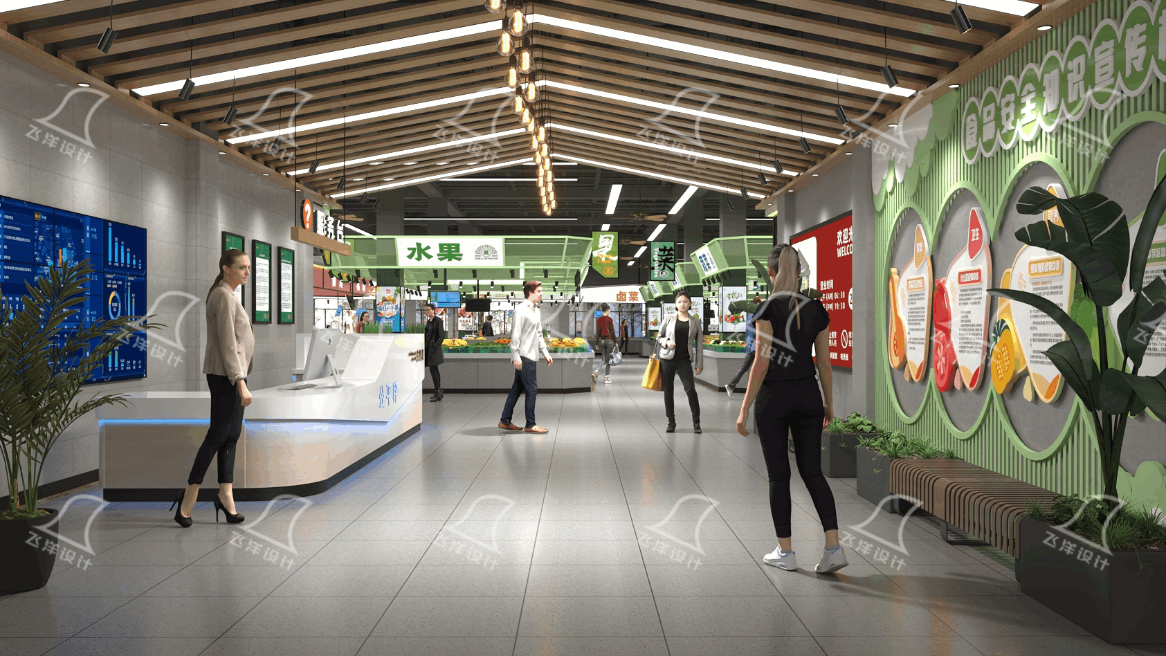 ?水產區:藍色系是理想選擇。藍色讓人聯想到水與潔凈,能突出水產區的特色,并與其它干區形成鮮明對比。