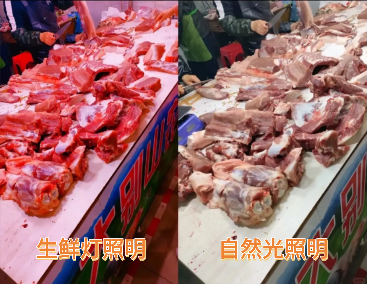 多地市場監(jiān)督管理局工作人員表示,目前市場監(jiān)管部門對“生鮮燈”的色標(biāo)特征、色溫值、顯色系數(shù)等要素并未做具體要求,在執(zhí)法和檢測過程中并沒有嚴謹明確的統(tǒng)一標(biāo)準(zhǔn),暫時以肉眼辨別為主。