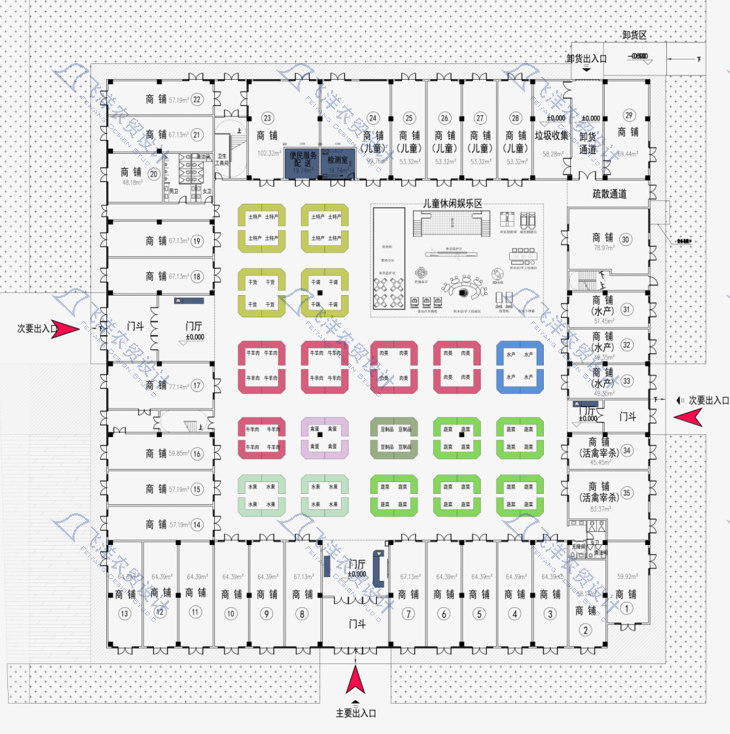核心層(農貿):嚴格遵循“劃行歸市”,以鮮明的色彩標識系統(果蔬綠、肉類橙、水產藍)集中布局生鮮業態,保障交易效率與基礎客流。