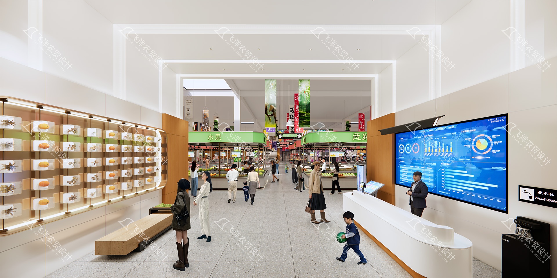 采用低矮、開放的攤位設計,最大限度保持空間視野的開闊與通透。重點強化自然采光與機械通風,特別是針對水產區等特殊區域,確保空氣清新,營造健康舒適的室內環境。