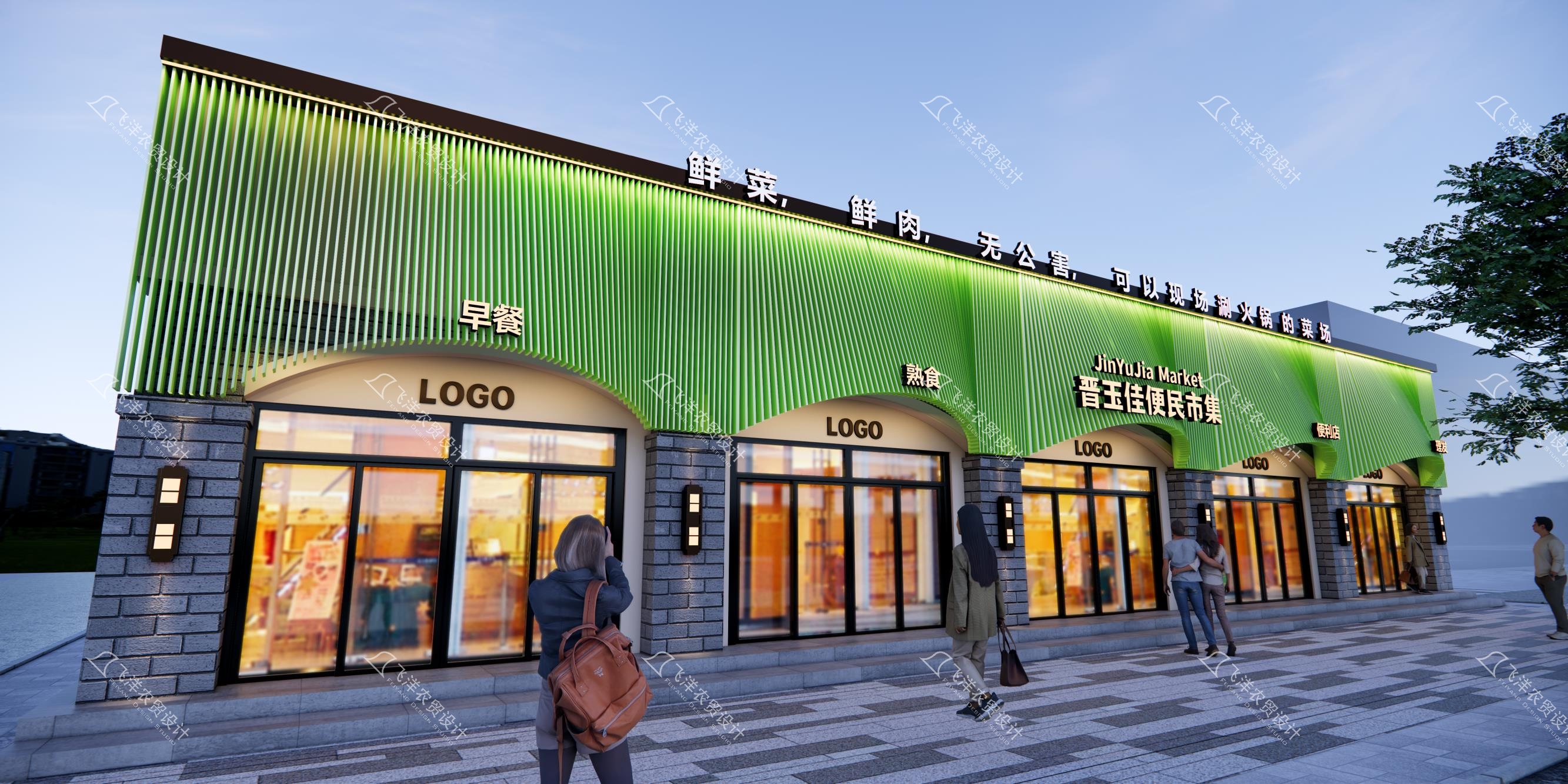 建立清晰符號:將“晉玉佳便民市集”中英文名稱與定制LOGO作為視覺核心,采用規整的構圖與質感材料(如仿石漆、金屬線條),形成強烈且統一的品牌記憶墻,一舉扭轉陳舊印象。