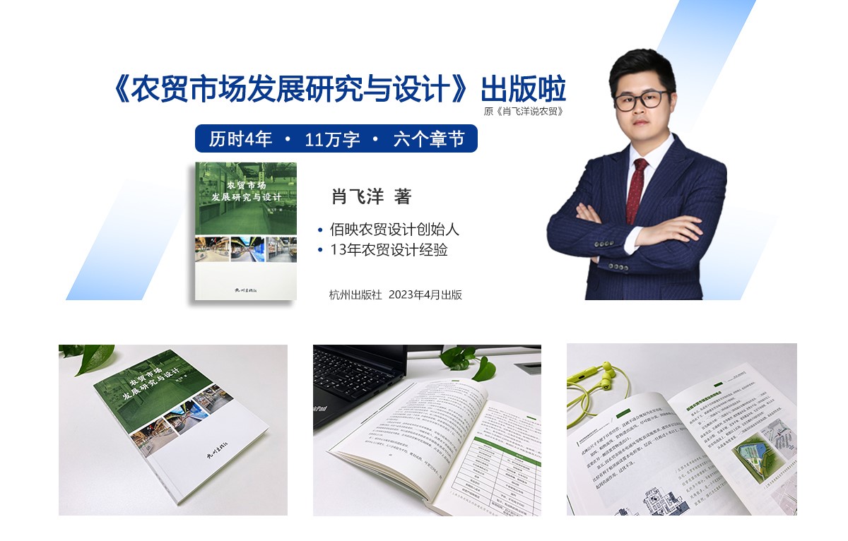 《農貿市場發展研究與設計》(原《肖飛洋說農貿》)于2023年四月出版,由佰映農貿設計創始人肖飛洋撰寫,他用他13年的農貿市場設計經驗來撰寫本書,全書歷時4年撰寫,共六個章節,11萬字。