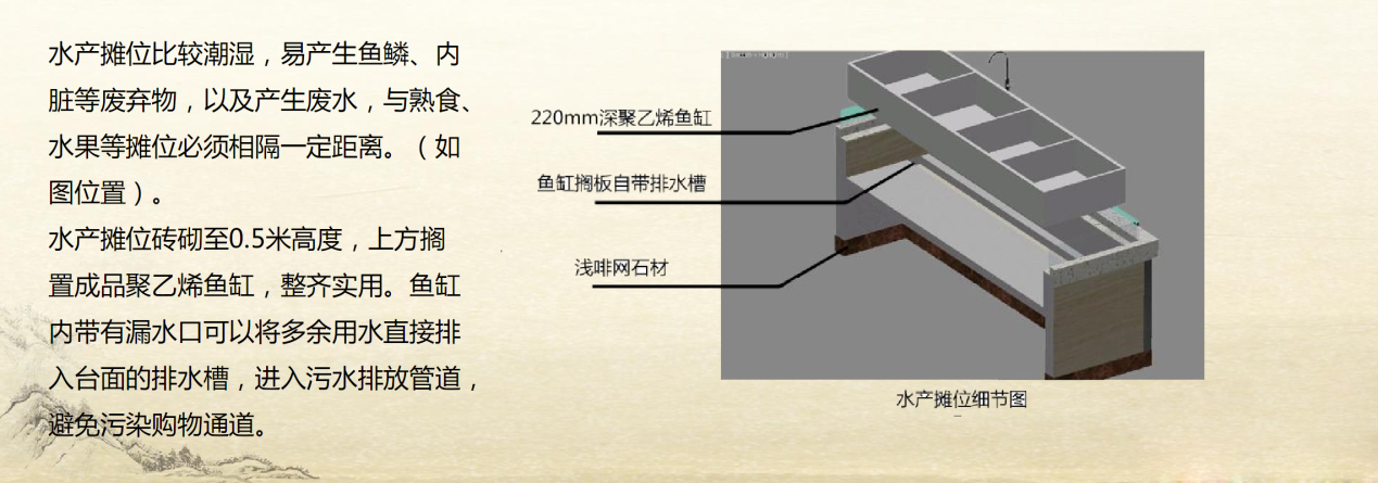 水產攤位比較潮濕,容易產生魚鱗、內臟等廢棄物,以及產生大量臟水,與熟食、水果等攤位必須隔離一段距離。另外來說,水產攤位磚必須砌到0.5米高度,上方擱置成品聚乙烯魚缸,整齊實用,魚缸內帶有漏水口可以將多余用水直接排入臺面的排水槽,進入污水排放管道,避免污染人流主干道和購物環境。